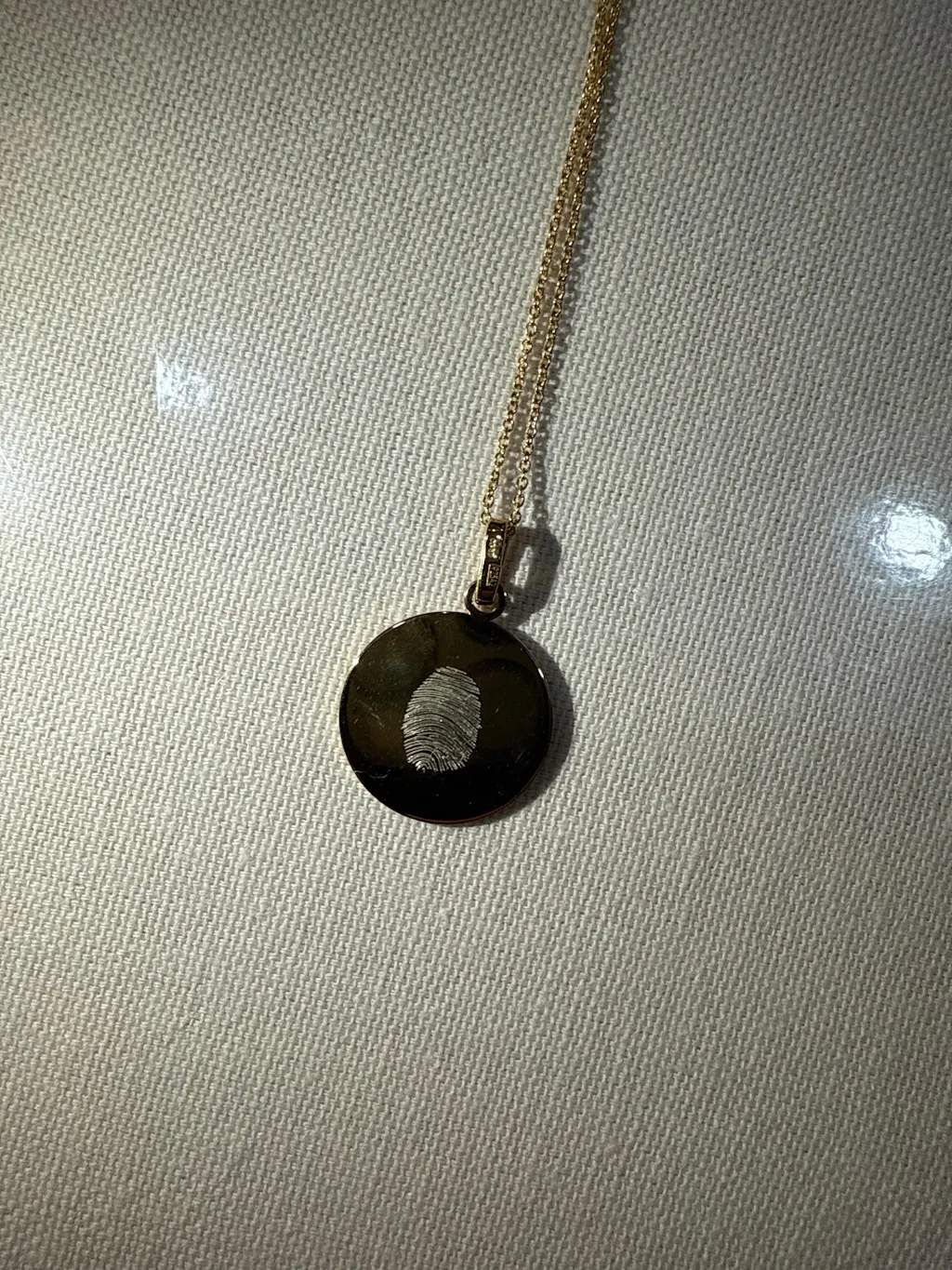 No puedo describir con palabras lo que senti al ver el colgante.Solo puedo decir que es PERFECTO,ver la huella de mi hija grabada con su nombre es un recuerdo que siempre llevare conmigo.Todo el proceso fue muy facil y me ayudaron desde el minuto uno en todo,gracias y mil gracias por poder tener este detalle tan maravilloso.